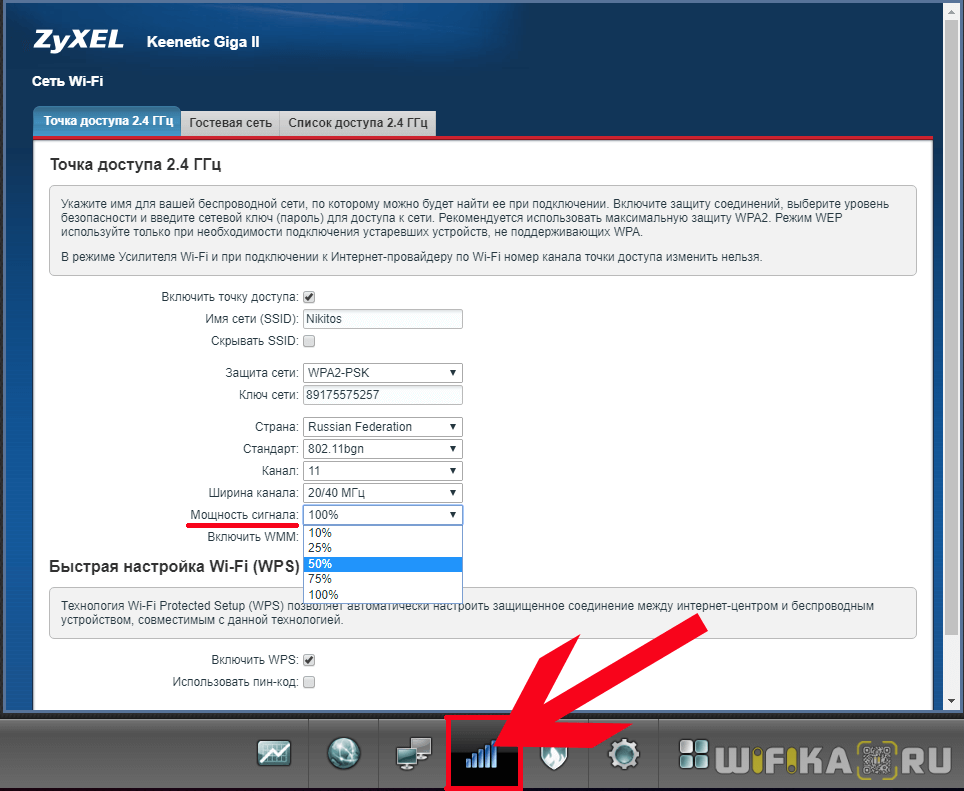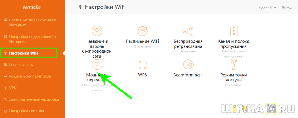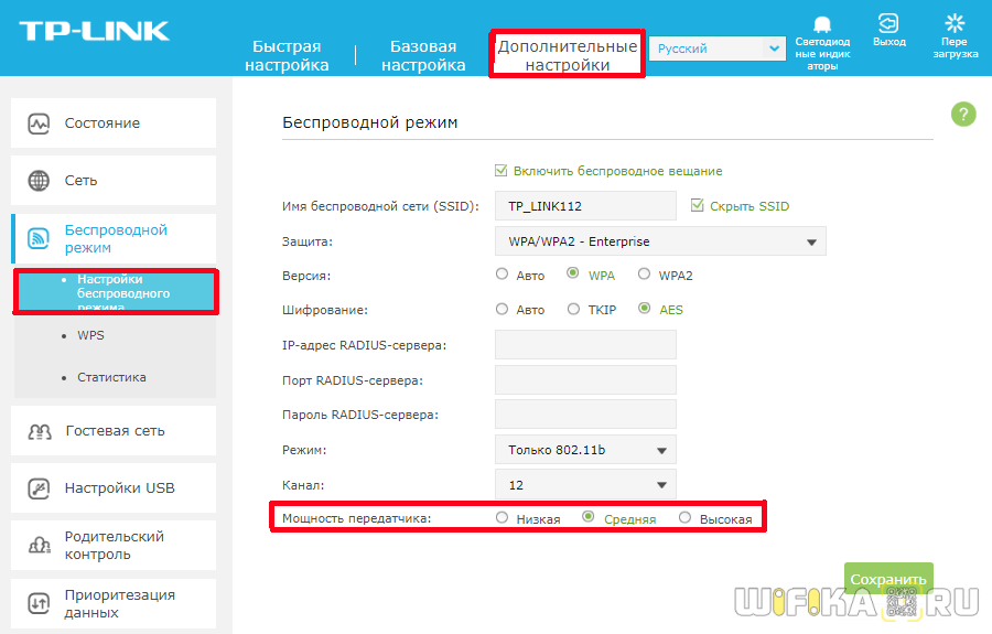 На некоторых моделях можно регулировать мощность передачи сигнала WiFi в расширенных настройках сети. Для этого надо в разделе «Расширенные настройки» сети найти параметр «Мощность передачи (Wireless Transmit Power)»: