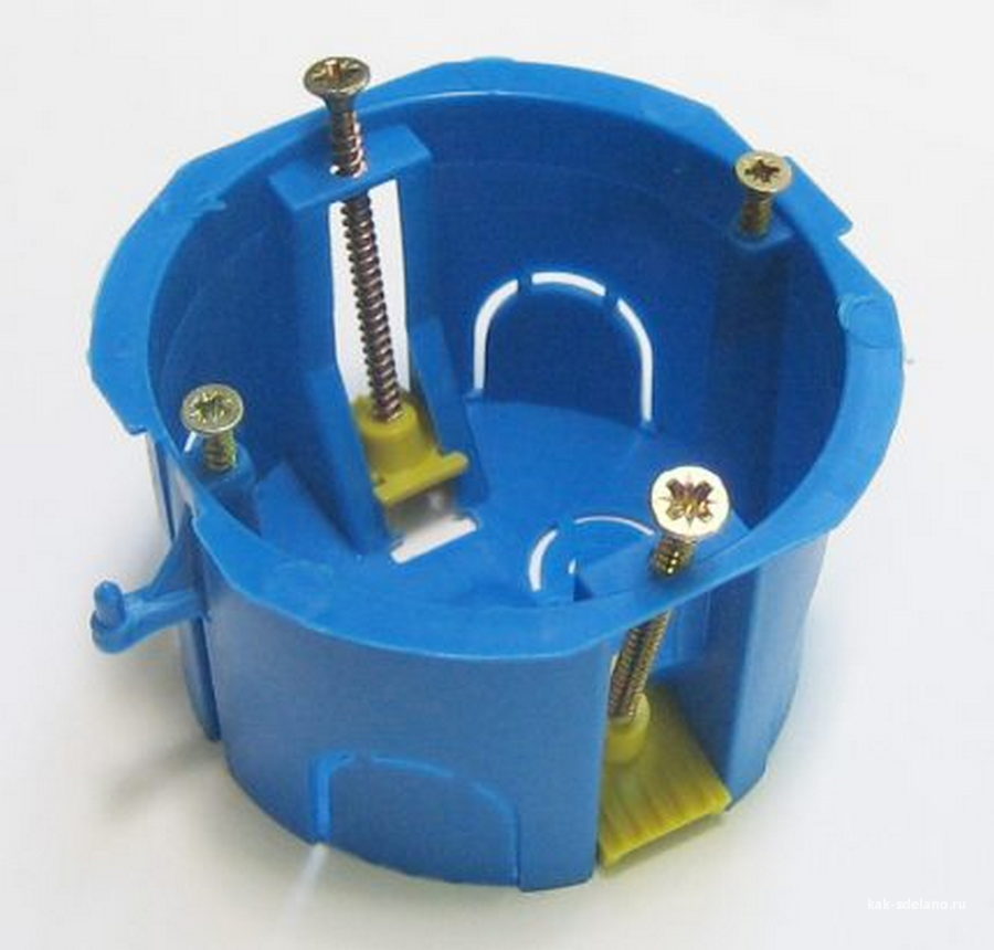 В коробках для гипсокартона имеются специальные прижимные пластиковые или металлические лапки, предназначенных для закрепления элементов в полых стенах. Зажимы крепятся на винтах, которые вращаясь, регулируют их положение.