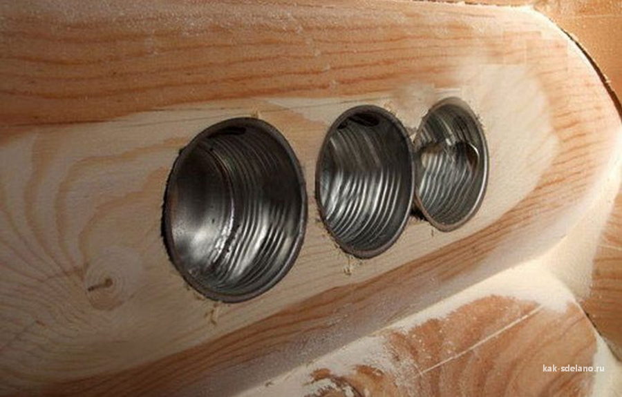 Ну и последний из вариантов крепления – в деревянной стене. Если Вы решили провести скрытую проводку в деревянном доме, что очень странно и небезопасно, нужно будет сделать штробы в дереве под установку металлических подрозетников.