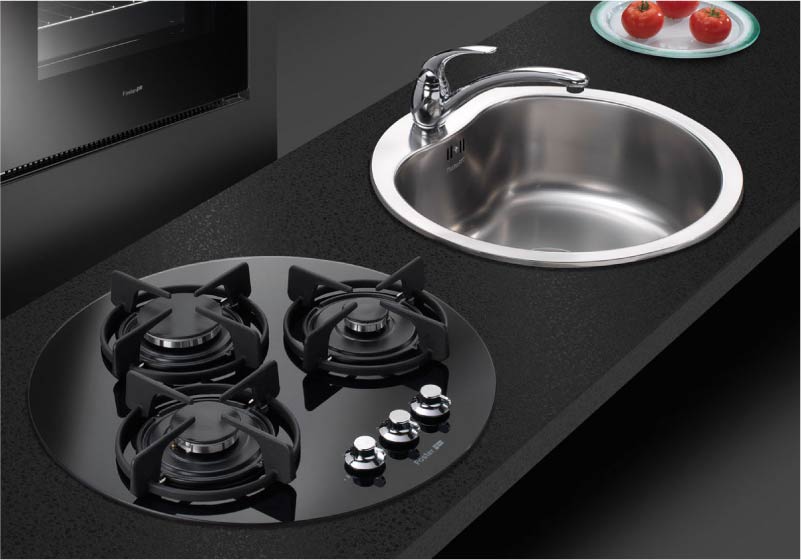 Круглая варочная панель гармонично соседствует с круглой мойкой. Также она актуальна, если в интерьере уже есть круглые элементы. Например, это могут быть принты на обоях/шторах, настенные часы или декоративное зеркало