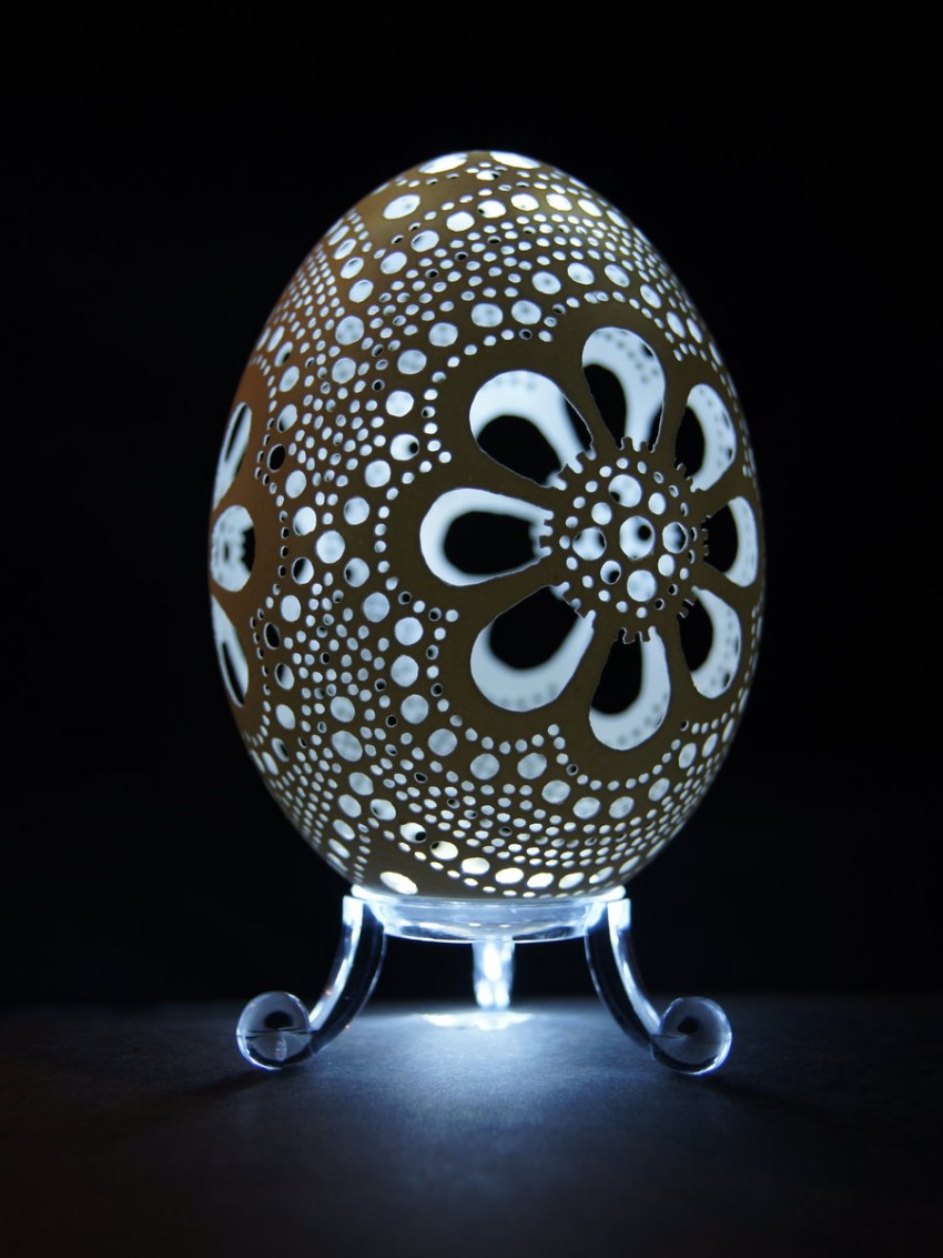 Высший пилотаж, конечно, это так называемый «китайский карвинг» — фигурная резьба по скорлупе пустого яйца. Китайские мастера оттачивали это искусство еще со времен глубокой древности, создавая настоящие шедевры скульптуры, а сейчас с новыми технологиями этот процесс стал легче, и художники смогли достигать новых высот.