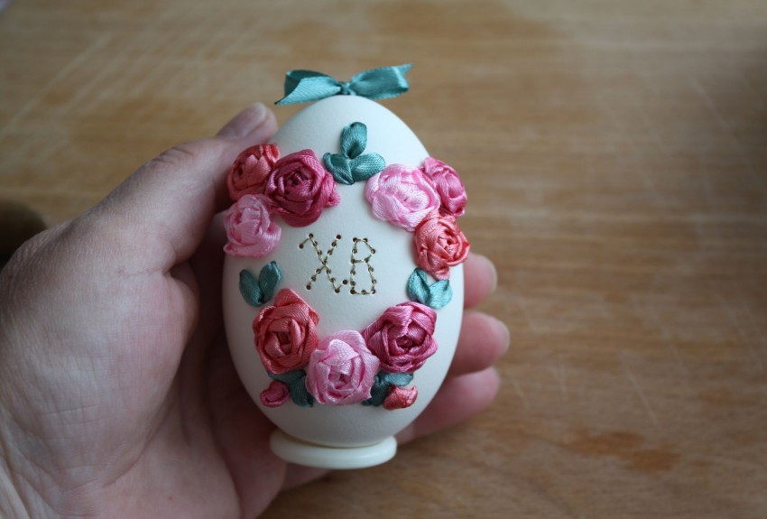 Узоры можно вышивать крестиком, бисером или делать объемные цветы при помощи лент. Только посмотрите на фото таких поделок — эти яйца ничем не хуже, а иногда и красивее писанок.