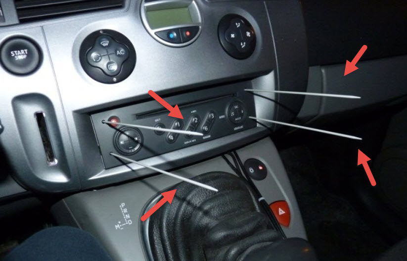 Это нужно учитывать, чтобы случайно не дернуть ГУ слишком сильно и не оборвать провода. Если же магнитола имеет 4 защелки, к защелкам доступ реализован через 4 круглых отверстия, куда вставляются П-образные ключи.