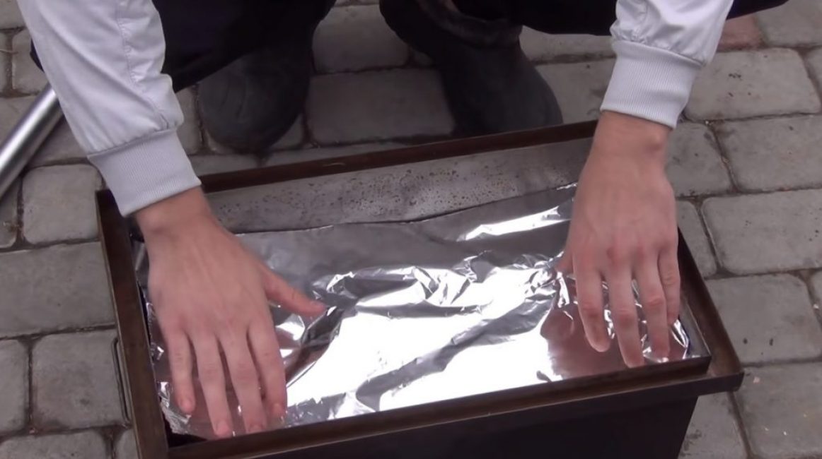 Чтобы коптильню было легче мыть от жира, необходимо на противень положить фольгу.