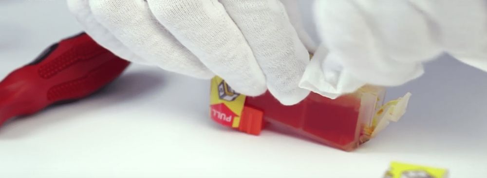 Перед установкой в принтер картридж вытирают, убирая остатки чернил