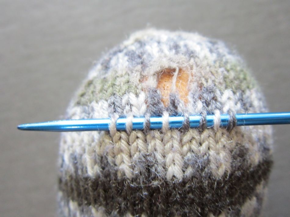 - Необходимо взять яйцо для штопки или лампочку, аккуратно срезать рваные края дырки, чтобы получилось что-то похожее на круг. Теперь при помощи нитки, которая по своей структуре соответствует волокнам носка, необходимо на расстоянии 2 мм от края продеть иглу.