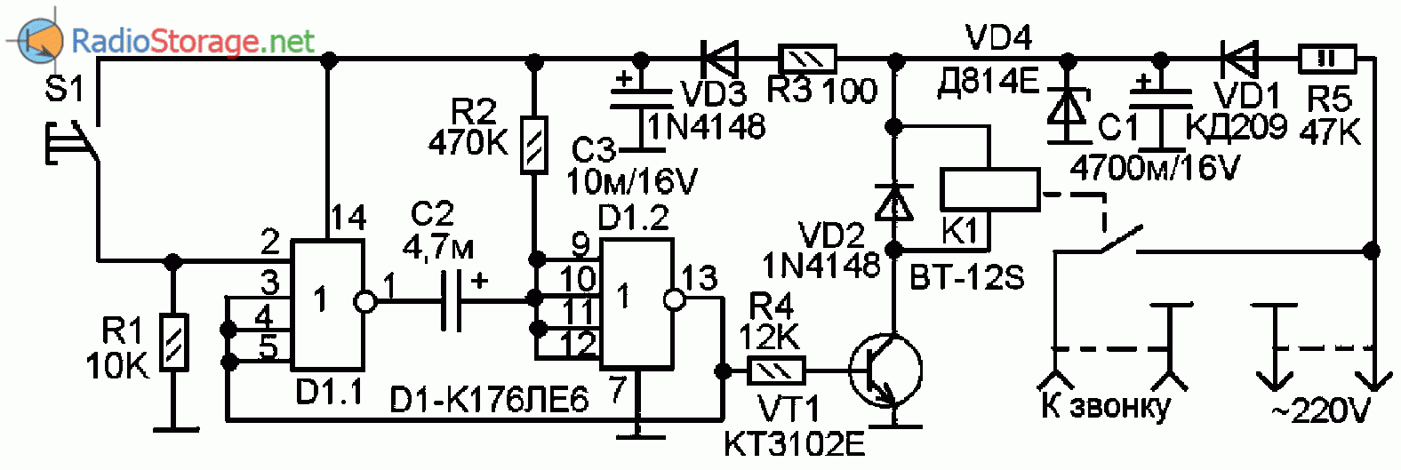 На рисунке 1 показана схема, ограничивающая продолжительность подачи тока временем в одну-две секунды. Впрочем, это время можно всегда самому выбрать оптимальным для конкретного звонка, подбором сопротивления резистора R2 и емкости конденсатора С2.
