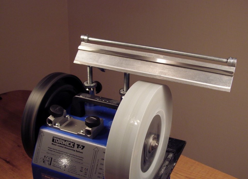 При помощи направляющей, расположенной вдоль оси вращения – нож перемещается поперек наждака, не меняя «угол атаки». Заточка получается высокого качества, временные затраты минимальны. Меняя круги, можно как точить, так и править ножи.
