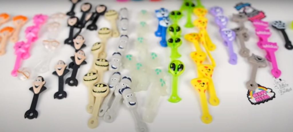 Смотрите, как часто повторяются Скрепыши в новой третьей серии. Вот коробка из ста штук. Ее купили специально, чтобы посмотреть, как выглядят новые Скрепыши 3, и какие у них наименования. Многие из них светятся в темноте. Например, есть: