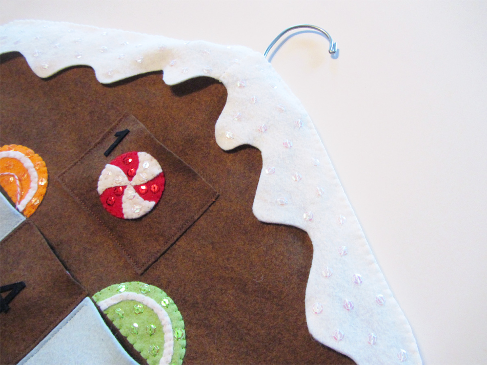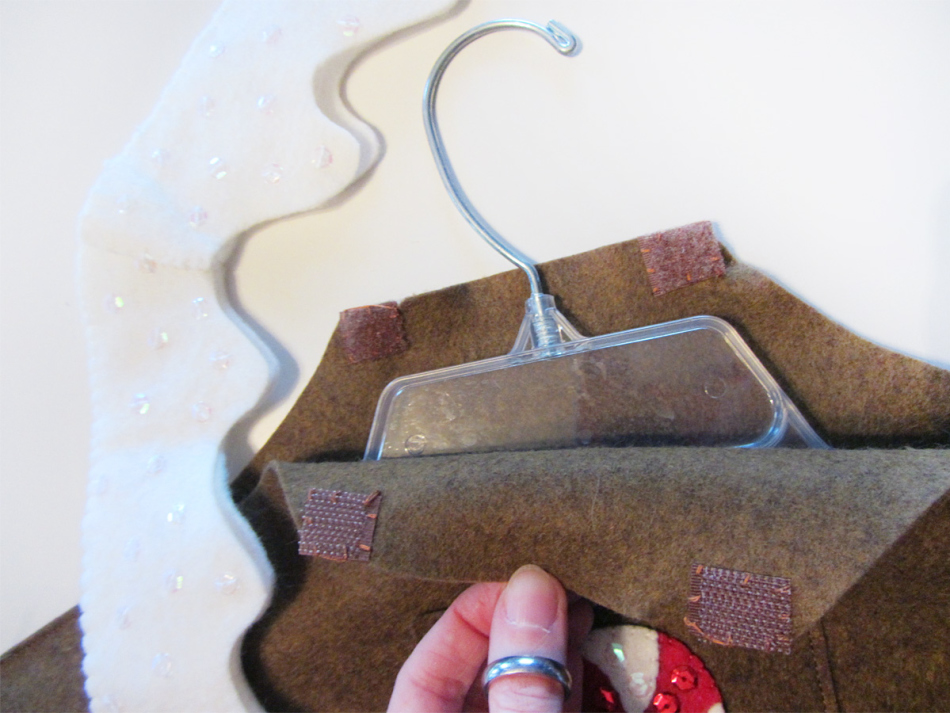 Вешалка для домика-календаря должна помещаться в заготовку, а соединить заготовку сверху можно либо нитками, либо липучками