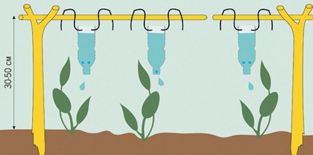Совсем не обязательно закапывать бутыли с водой в грунт, можно обойтись поверхностным капельным поливом. Для его устройства над посадками сооружают прочные опоры и прикрепляют к ним емкости, наполненные водой. В зависимости от способа расположения в горлышке или днище бутылки проделывают отверстия, через которые влага поступает к растениям.