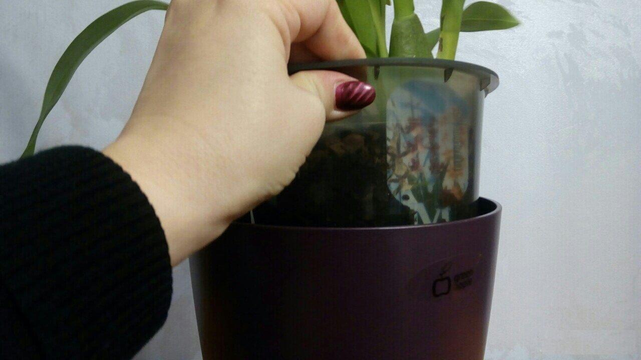 - установить цветок в заранее подготовленную емкость для воды, изготовленную из бутылки в 2 литра.