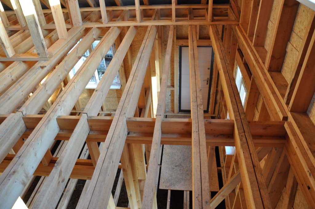 По каркасной технологии домостроения брус также используют для обустройства стропильной системы под укладку кровельного материала.