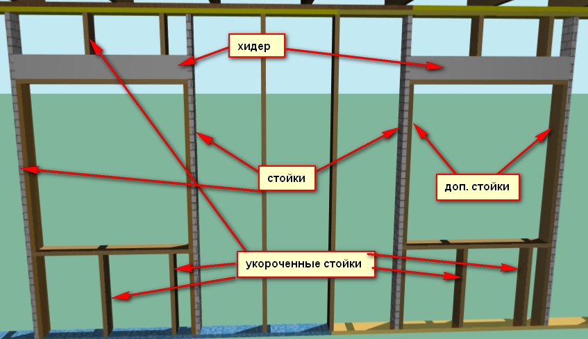 - При монтировании стоек следует проконтролировать их вертикальность. Крепления стоек внизу недостаточно для жесткости конструкции, пока не смонтирована верхняя обвязка. Поэтому стойки укрепляются укосинами, можно использовать одну укосину для нескольких стоек.