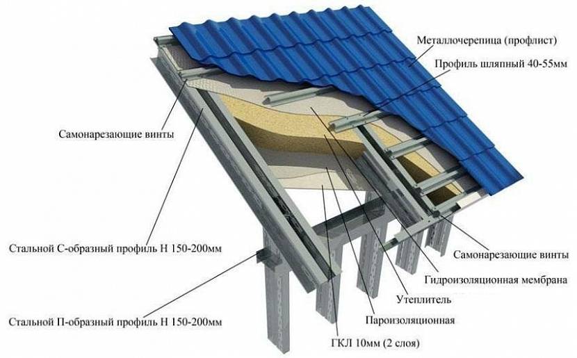 Для крыши из тяжелых материалов применяют более прочные трубы. Такую конструкцию собирают и крепят непосредственно на крыше.