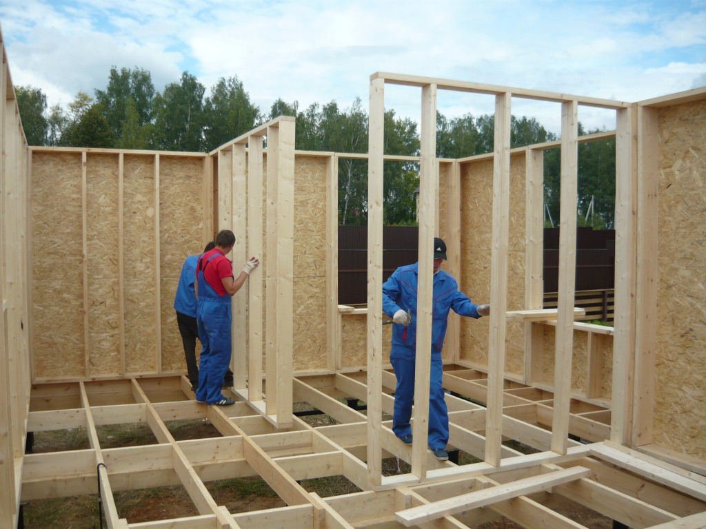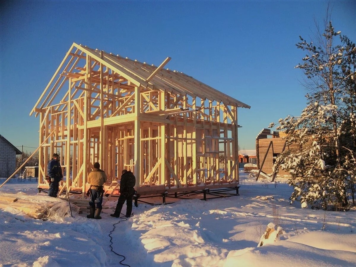 Стены каркасного здания можно собирать в любое время года, независимо от температуры окружающей среды. Единственное, чего необходимо избегать при выполнении монтажных работ – это намокания строительных материалов, которые изготовлены из древесины, несмотря на то, что они дополнительно пропитаны специальными защитными составами.