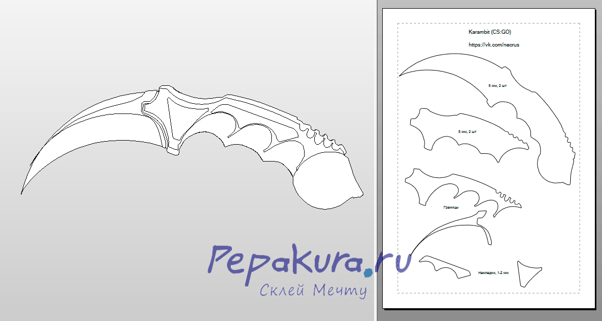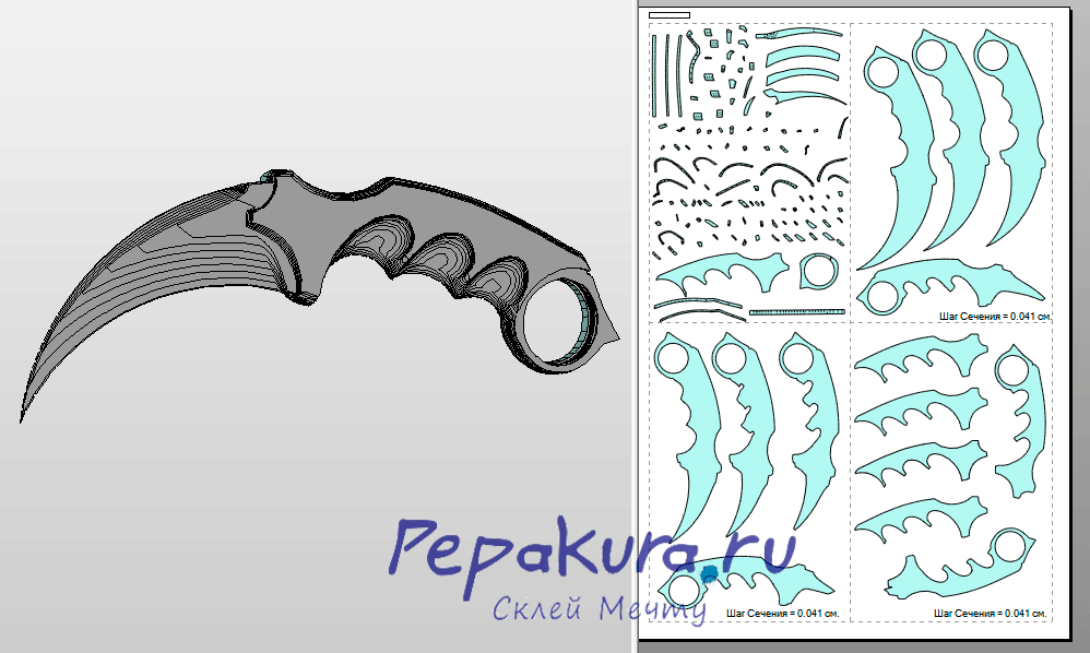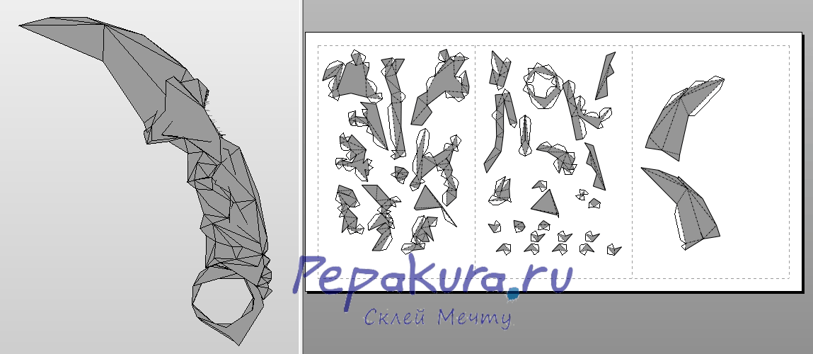 Довольно интересная развертка и подход. Одна половина — привычная нам пепакуровская версия (но склеить её, мне кажется, нереально), вторая — модель в сечении, которую нужно набирать из частей, как первую. Однако эта версия из «наборных пластин» получится значительно фактурней, нежели первый вариант. Но здесь отсутствуют верхние накладки. Идеальный вариант совместить первый вариант Керамбита и этот.