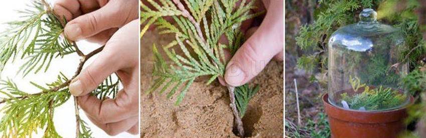 Заготовку черенков проводят в весеннее время. Нарезку верхушечных черенков производят с молоденьких боковых стеблей. Длина черенков может варьироваться от 5 до 15 сантиметров. Нижнюю часть черенков надо освободить от хвои, а затем их сажают для укоренения в горшки, наполненные почвосмесью, в состав которой вошли перлит и песок (1:1), в эту смесь также рекомендуется всыпать немного меленькой хвойной коры. После этого емкость нужно накрыть пакетом из полиэтилена. Если постоянно поддерживать влажность воздуха близкую к 100 процентам, то тогда черенки дадут корешки уже через 4–8 недель. Черенки при желании можно посадить сразу в открытую почву, при этом их нужно накрыть пластиковыми бутылками, у которых заранее следует срезать горлышки. Черенки, посаженные в открытую почву, могут пережить зиму без укрытия, но только в том случае, если они развиваются нормально. Если укоренение черенков происходит крайне медленно, то зимовать они должны будут в помещении.