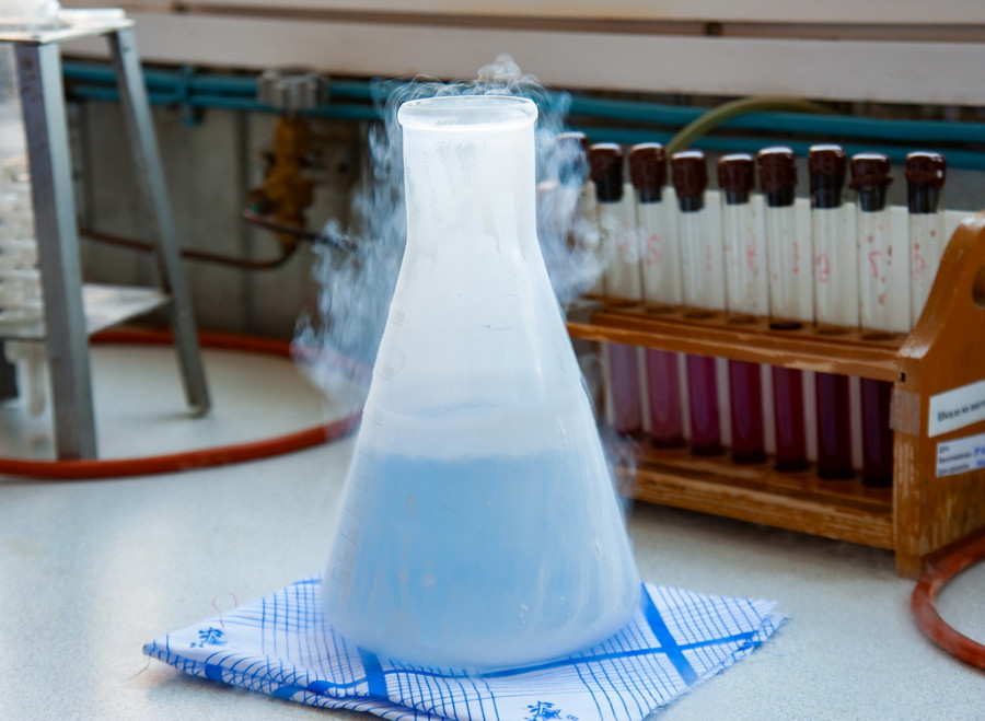 В лабораторию кислород приносят в ведрах и наливают в колбы. Голубая жидкость выходит паром — выкипает,поскольку ее температура составляет -173° С. Если плотно закрыть колбу,будет взрыв. Так что продукт «Алтайстройдетали» особо опасен.