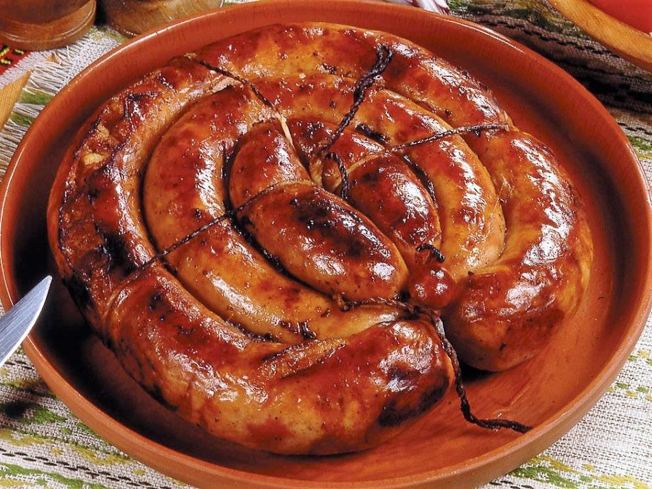 Когда кишка полностью набьётся фаршем – завязываем конец черева толстой нитью и приступаем к запеканию вкусных пикантных колбасок. Дома мы это будем делать классическим способом – в духовке, с помощью специальных форм для запекания.