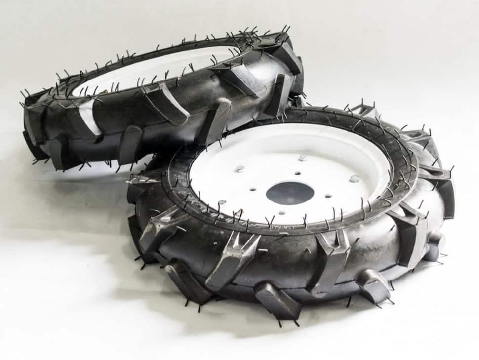 Для первичной обработки целины и почвы с повышенным содержанием камней, лучше использовать литые колёса. Они практически не получают механических повреждений ввиду отсутствия внутренней камеры.