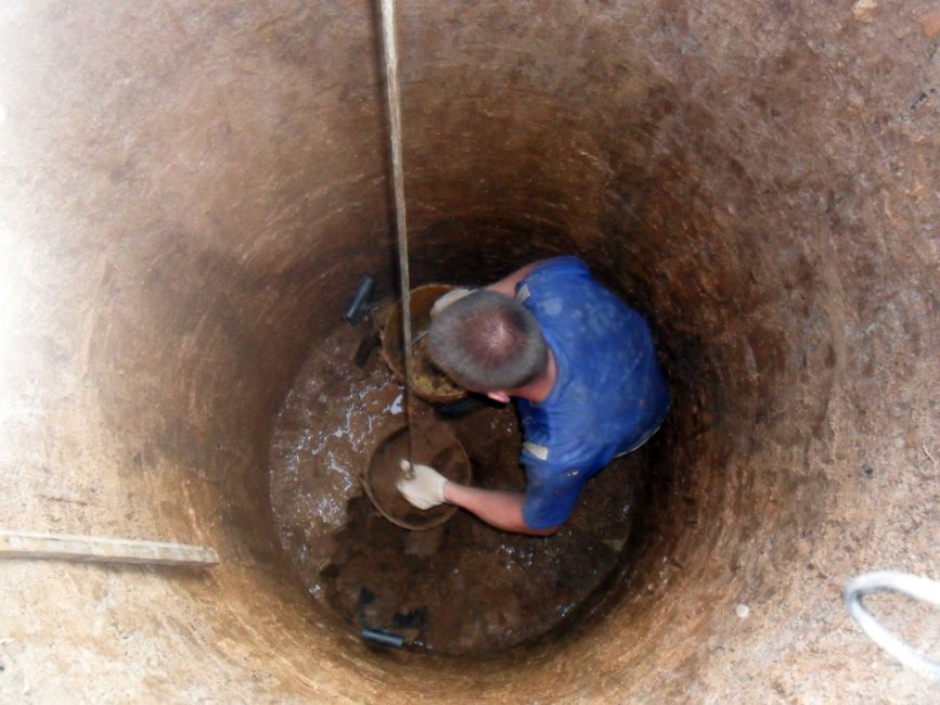 - самая первая чистка производится вручную; для этого необходимо спуститься в колодец с обычной лопатой и ведром; с таким количеством грязи насос пока еще не справится
