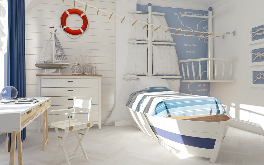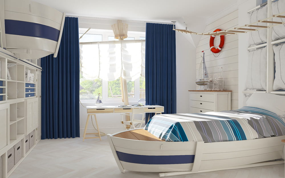 Сине-белая гамма с небольшими акцентными красными деталями, характерны для морского стиля. В качестве стилистического декора используются макеты или картинки яхт, маяков и кораблей, спасательные круги, якоря, штурвалы, компасы, изображения с подводными пейзажами и морскими животными. Шторы можно подобрать так, чтобы они максимально напоминали паруса и подхватить их канатами с красивыми морскими узлами.