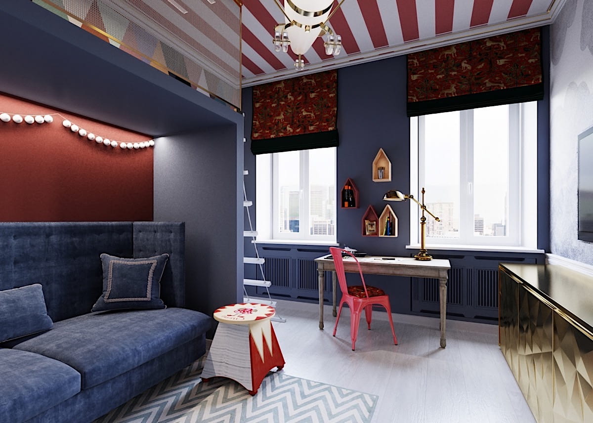Удачное сочетание синего, белого и красного цвета в интерьере детской комнаты