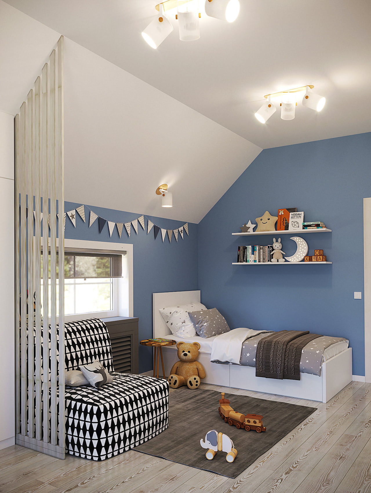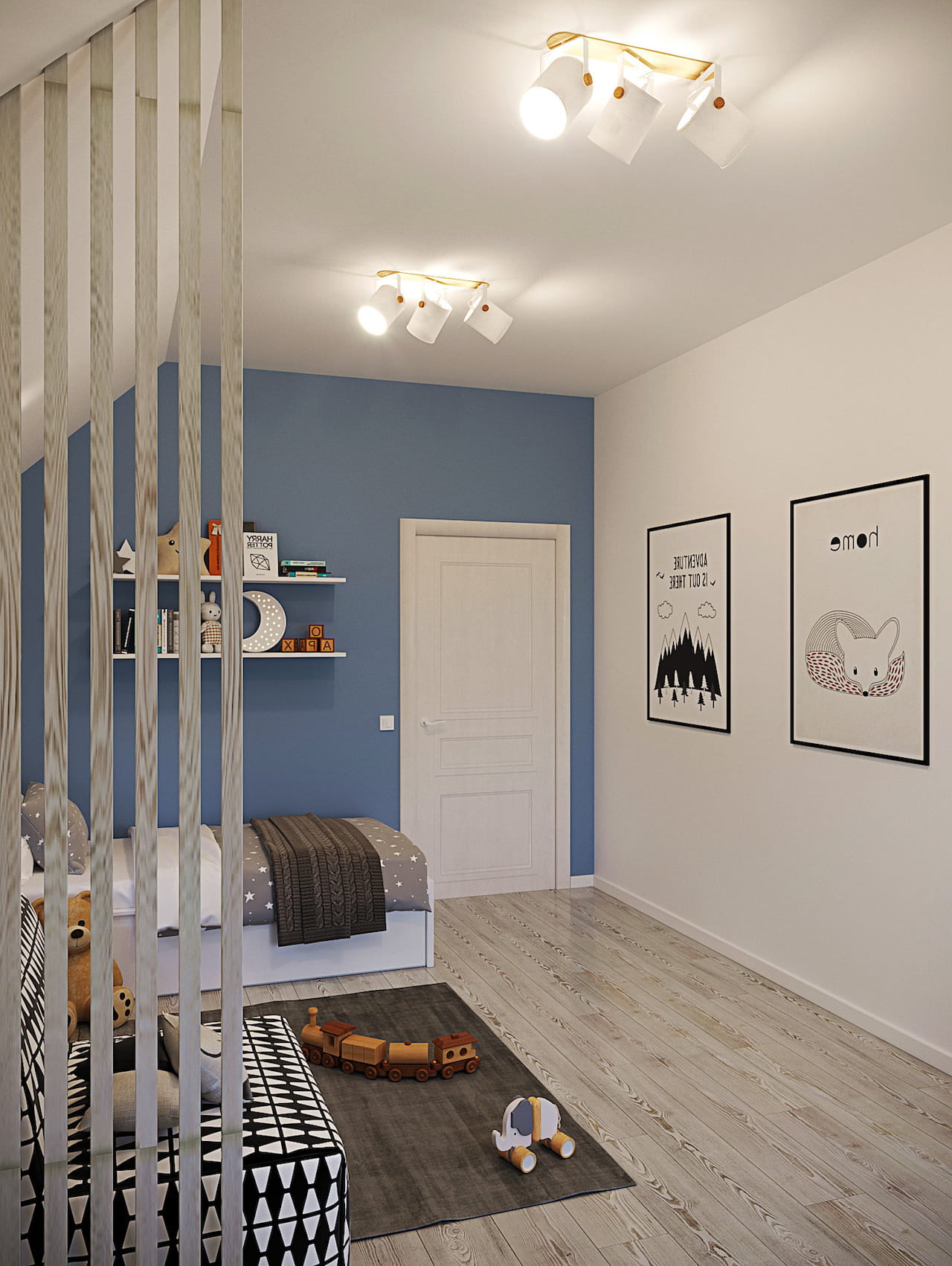 Так, в сегменте игр актуальны яркие оттенки и пестрые принты, а в рабочем месте – спокойные цвета пастельной гаммы с однотонным покрытием. Разделить комнату можно и с помощью отделки стен, освещения, ширмы, стеллажа.