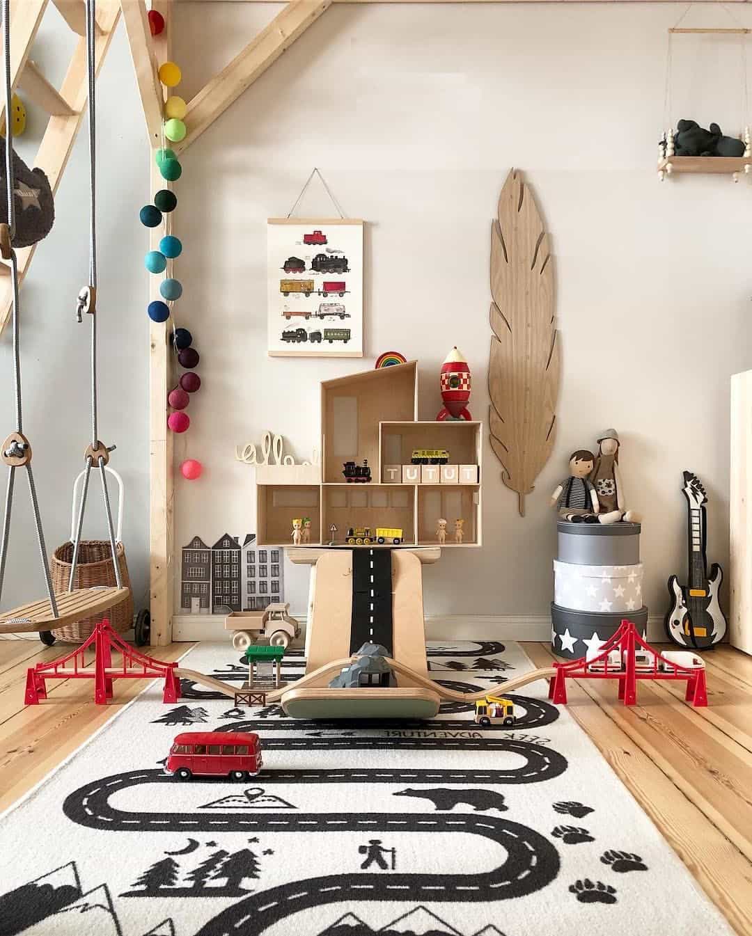 - задействуя вертикальное пространство для хранения (подвесные полки), можно освободить место для активных игр на полу.