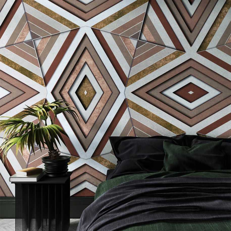 Абстракция в любом цветовом исполнении будет выглядеть удачно. Для молодежного стиля можно выбрать разноцветные фигуры, стиль минимализм дополнит стена с четкими геометрическими линиями серебристого цвета на темном фоне. Грамотно подобранная цветовая гамма и принт помогут визуально расширить небольшое помещение и выделить определенную часть комнаты при необходимости.