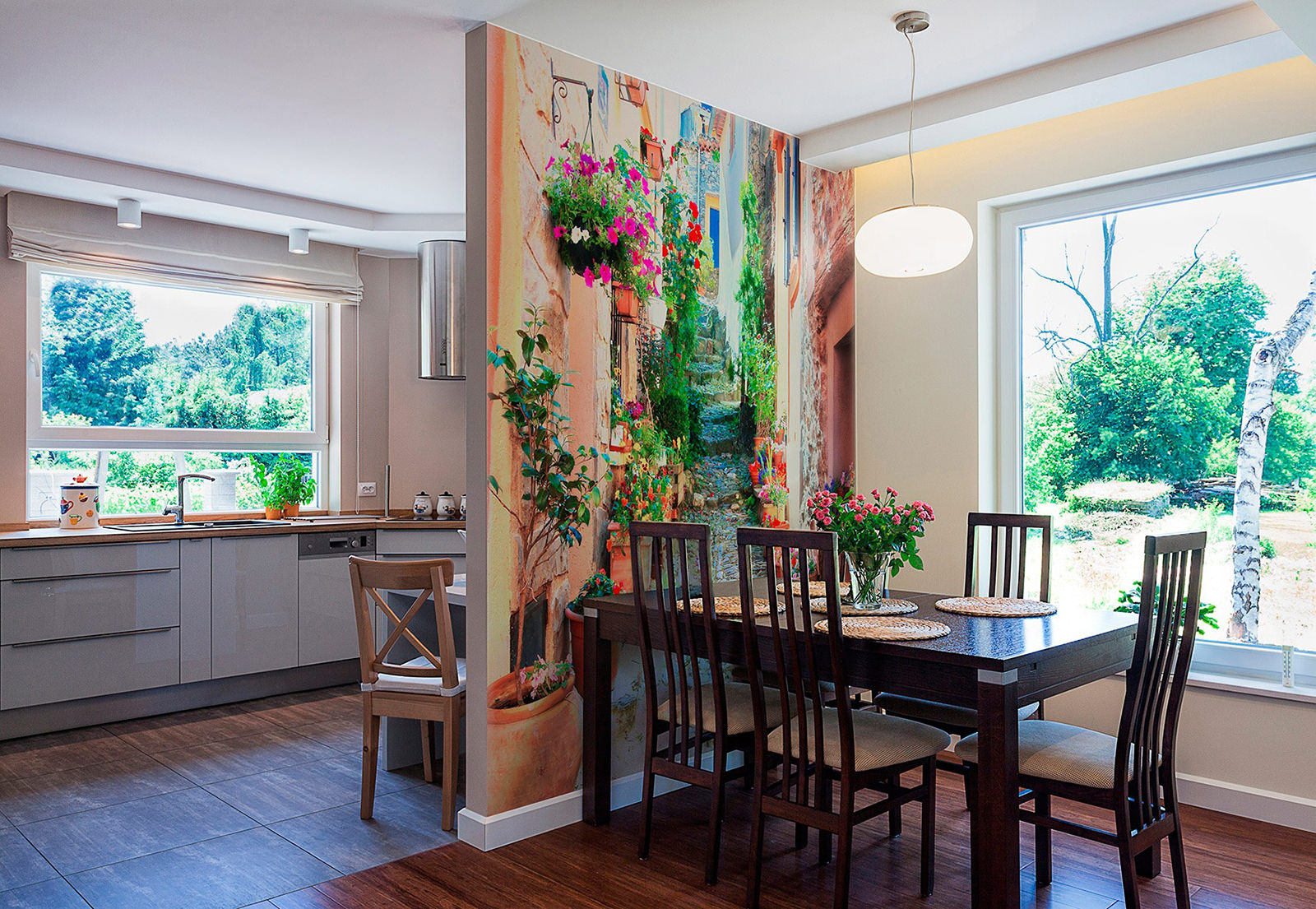 Фотообои на кухне интересно дополнят помещение, сделают его более живым