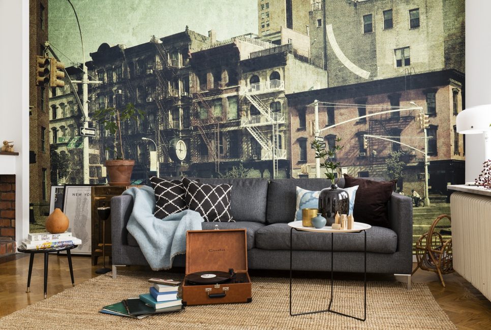 Благодаря своей уникальности и долговечности, новую волну популярности завоевали фотообои. Стоит забыть о бумажных изображениях природы, которые раньше встречались в квартирах. Добавить городской гостиной уюта и тепла можно с помощью полотен с камином, а имитация книжных полок наполнит атмосферу аристократизмом и роскошью.
