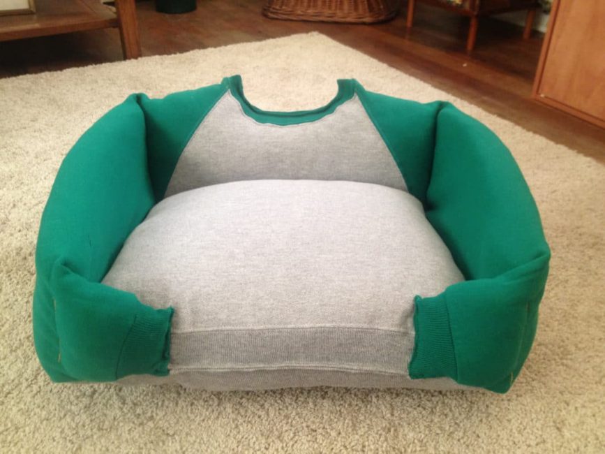 Чехол сшивается из двух кусков ткани. Подвесные детали каркаса оберните тканью или шпагатом. Если тканевое дно лежака будет чуть провисать, ничего страшного – если по форме его кровать будет напоминать гамак, животное будет этому только радо.