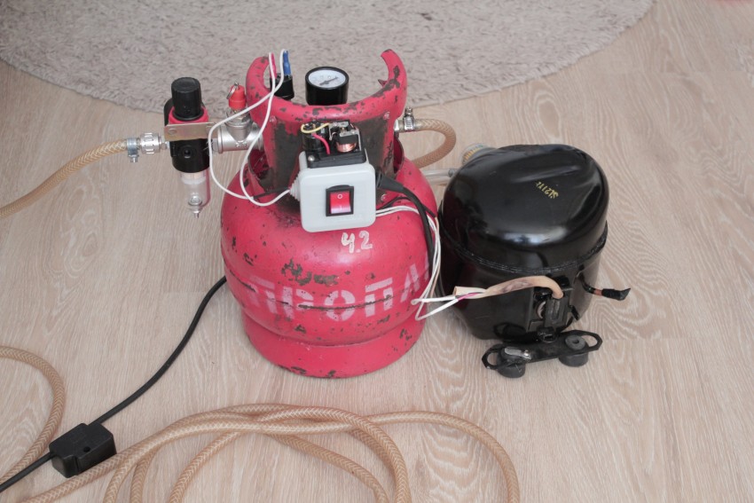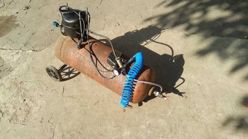 Также можно сделать компрессор из газового баллона. Но сначала из баллона нужно выпустить газ, после чего скрутить вентиль. Далее, нужно полностью заполнить баллон водой для удаления остатков газа. Баллон следует промыть водой несколько раз и, по возможности, высушить. Обычно под баллон устанавливают газовую горелку и выпаривают из емкости всю влагу.