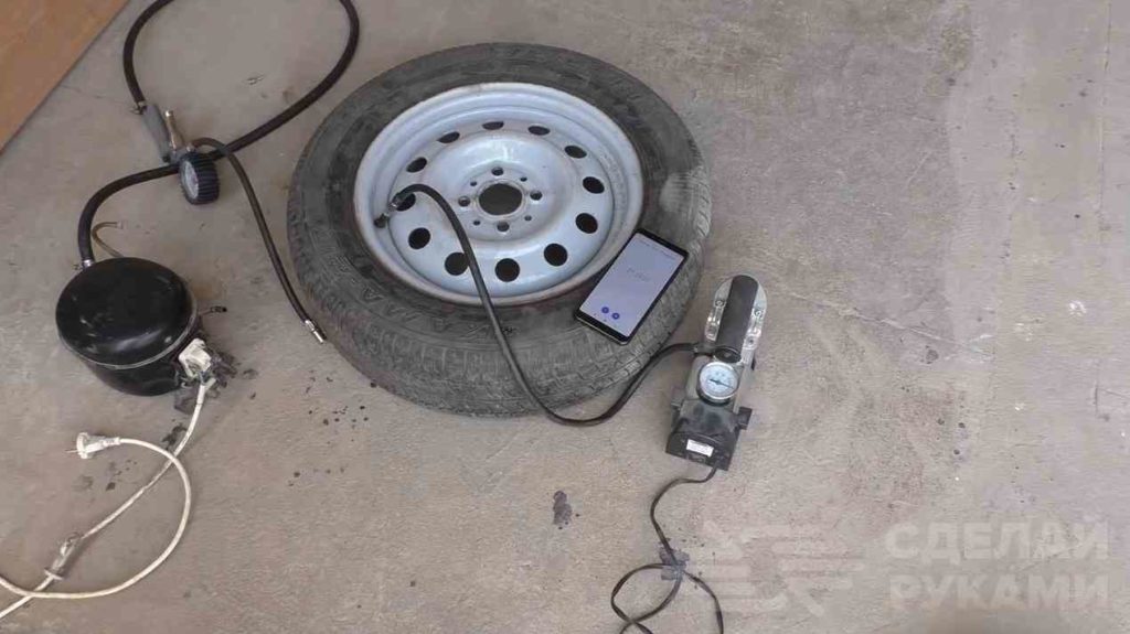 Тест скорости показал, что компрессор от холодильника создает давление в колесе в 2 атмосферы за 2 минуты 45 секунд.