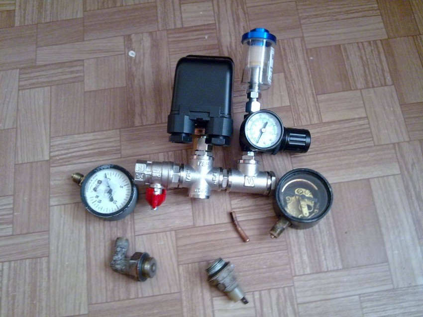 Водопроводная крестовина вкручивается в огнетушитель на место ЗПУ. При изготовлении компрессора надо обмотать уплотняющей лентой все винтовые соединения и дополнительно нанести на них герметик. На верхнюю часть крестовины наворачивают реле, выполняющее функцию регулирования давления в ресивере.
