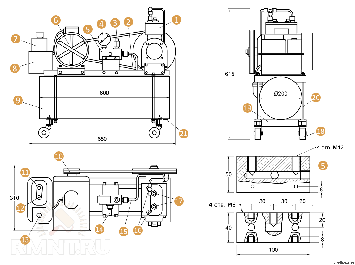 Компоновочный чертёж компрессорной установки: 1 — компрессор от ЗИЛ-130; 2 — рама из уголка; 3 — предохранительный клапан; 4 — стандартный манометр; 5 — коробка раздаточная; 6 — трёхфазный электродвигатель (1 кВт, 1380 об/мин); 7 — коробка пуска (от стиральной машинки); 8 — конденсаторная батарея (ёмкость рабочая — 25–30 мкФ, пусковая — 70–100 мкФ); 9 — ресивер (из кислородного баллона или глушителя КрАЗ); 10 — передача клиноременная (снижение оборотов 1:3); 11 — кнопка «Стоп»; 12 — кнопка «Пуск двигателя»; 13 — кнопка для краткосрочного включения пусковой конденсаторной батареи; 14 — штуцер расходного (выпускного) клапана; 15 — трубки алюминиевые Ø 6 мм; 16 — клапаны выпускные; 17 — клапаны впускные; 18 — колёса (4 шт.); 19 — поперечное ребро жёсткости; 20 — шпилька стяжная (М10 — 4 шт.); 21 — сливное отверстие с пробкой