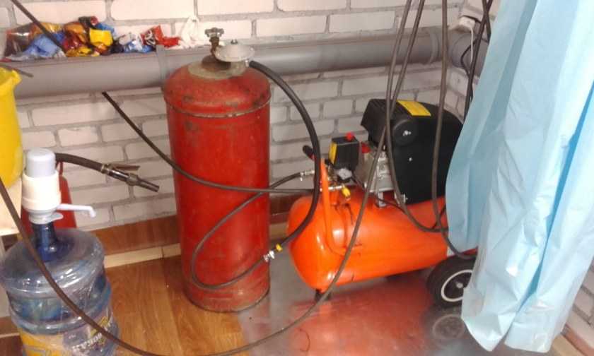 Для этой цели подойдет баллон от углекислотного огнетушителя емкостью не менее десяти литров, только так можно будет обеспечить равномерное давление воздуха на выходе.