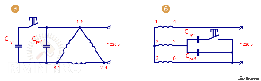 Подключение трёхфазного двигателя в однофазную сеть: а — «треугольником»; б — «звездой»