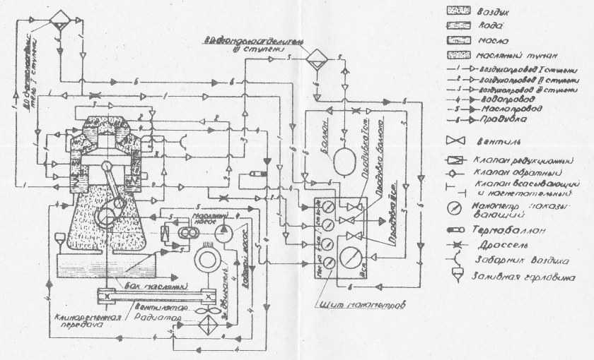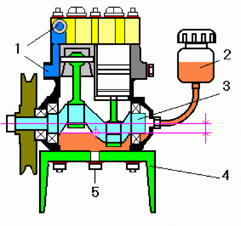 В качестве привода можно взять двигатель на 380 В мощностью 4 кВт. Передача вращения вала двигателя на вал поршневой группы осуществляется с помощью эксцентрика, который служит также и приводом для масляного насоса плунжерного типа. Он создает давление масла около 2 кгс/см2.