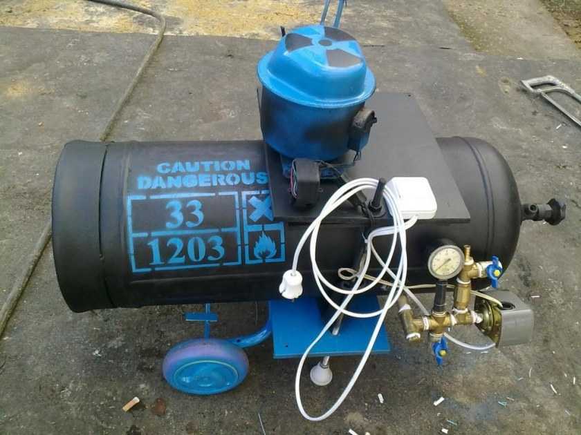 Из газового баллона или огнетушителя создается воздушный компрессор средней мощности. Для этого соединяют старый огнетушитель (баллон) и мощный автокомпрессор для подкачки колес. При самостоятельном изготовлении аппарата нужно соблюдать следующие правила: