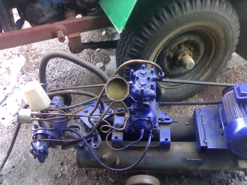 - Сборка. Резервуар устанавливают на раму, которую собирают из досок на колесиках. Мотор-компрессор закрепляют на резервуаре, отделив их резиновой прокладкой. Вначале подключают к входящей трубке бензиновый фильтр и только потом дизельный. Так воздух будет защищен даже от небольшого загрязнения. Если во время демонтажа трубки деформировались, их следует развальцевать. Чтобы аппарат правильно работал, пусковое реле должно быть установлено в правильном положении, которое отмечено стрелкой на его крышке. Места соединения тумблера, пусковое реле и реле давления следует защитить изолентой, так как через них проходит электропитание. Выходную трубку от компрессора подключают в ресивер с помощью переходника. Редуктор с влагомаслоуловителем устанавливают после манометра. Затем монтируют шланг, оснащенный пневморозеткой.