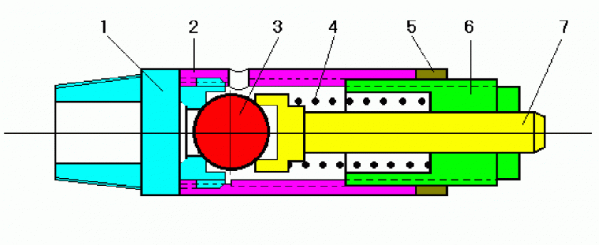 Прибор внутреннего смешивания краски и воздуха управляется триггером. Нажатием на кнопку открывается клапан, воздух проходит в корпус, смешивается с краской. Художник получает линию необходимой толщины.