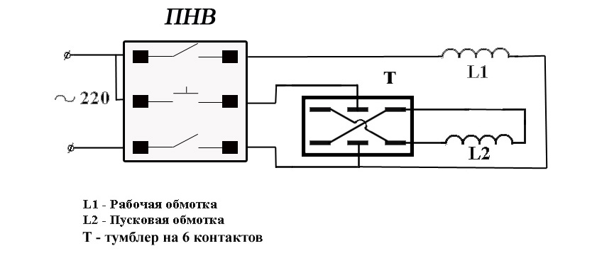 Подключение однофазного двигателя с пусковой обмоткой через кнопку ПНВС
