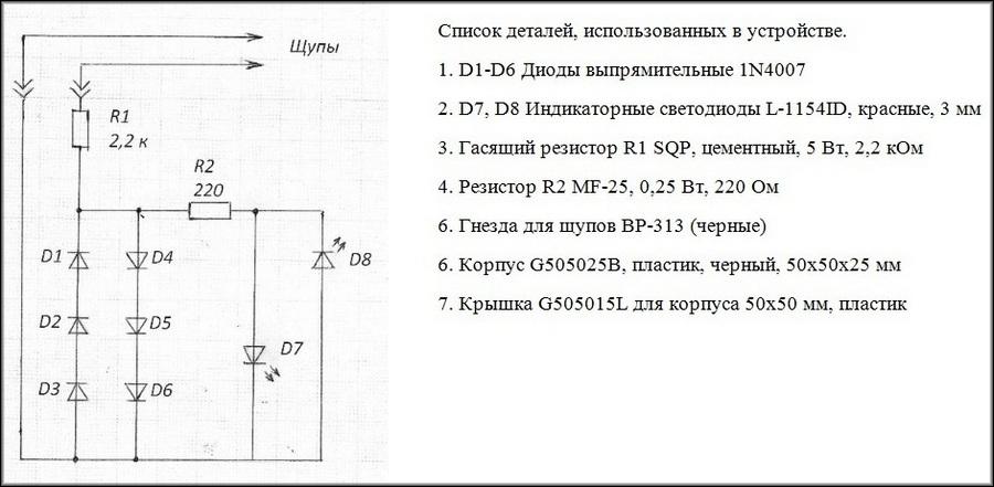Сам диодный ограничитель из двух параллельных цепочек диодов D1-D3 и D4-D6. Это сделано для того чтобы от любого диода в цепи снять напряжение порядка 2 вольт для работы светодиодных индикаторов D7, D8. Поступающий ток на светодиоды ограничивается резистором R2.