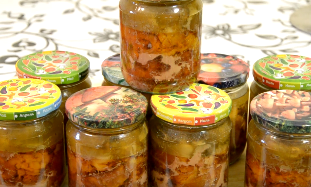 У горлышка оставить 2 см пустого места. Сверху в каждую емкость влить по 1 ст. л. масла. Закатать банки и установить в автоклав. Выдержать 45 минут при 115 градусах. Подождать остывания и убрать консервацию на хранение.