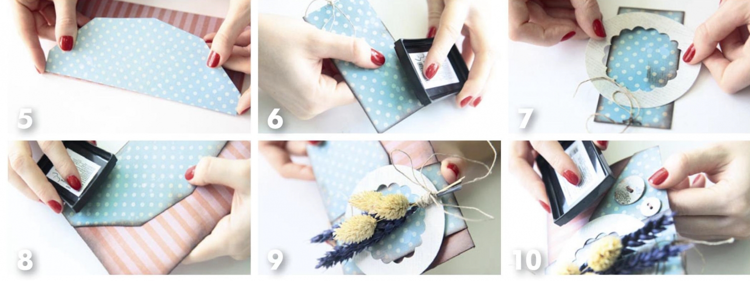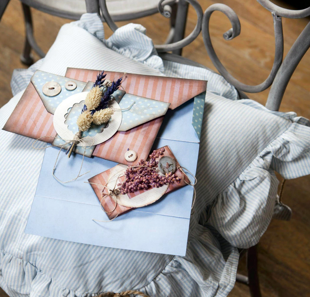 - Декорируем конверт сухоцветом, пуговицами. Используем для крепления двусторонний скотч или горячий клей.