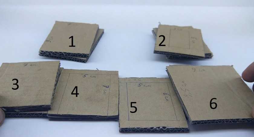 В двух других частях нужно вырезать по центру еще один прямоугольник размером 5×3 см. В следующем вырезать буквой П размером 7×5 см., и в последнем – 6×4 см.