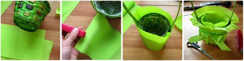 Красиво оплести такие емкости сможет каждый, кто в детстве держал в руках клей и ножницы. Помогут в этом полоски бумаги, ткани или пряжа.